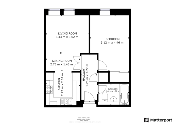 The apartment features a well-proportioned, carpeted double bedroom with a built-in wardrobe. The family bathroom includes a bath/shower combination. The spacious carpeted lounge provides ample space for seating and dining. Connected to the lounge is a well-equipped kitchen with integrated appliances such as a fridge freezer, washing machine, electric oven, and dishwasher, along with ample storage.