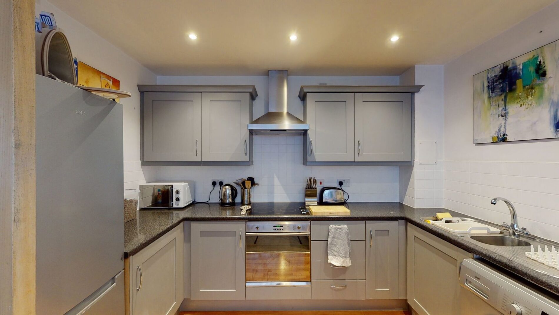 Situated on the ground floor of the development, this modern flat has a good sized open plan kitchen and lounge. The kitchen has a large fridge/freezer, electric hob, oven and washing machine. There is plenty of storage and a breakfast bar with chairs. The living room comes with settee, coffee table, armchair and tv unit. There are two double bedrooms both with wardrobe storage space and the master has its own ensuite bathroom. There is also a family bathroom with bathtub, shower and heated towel rail.