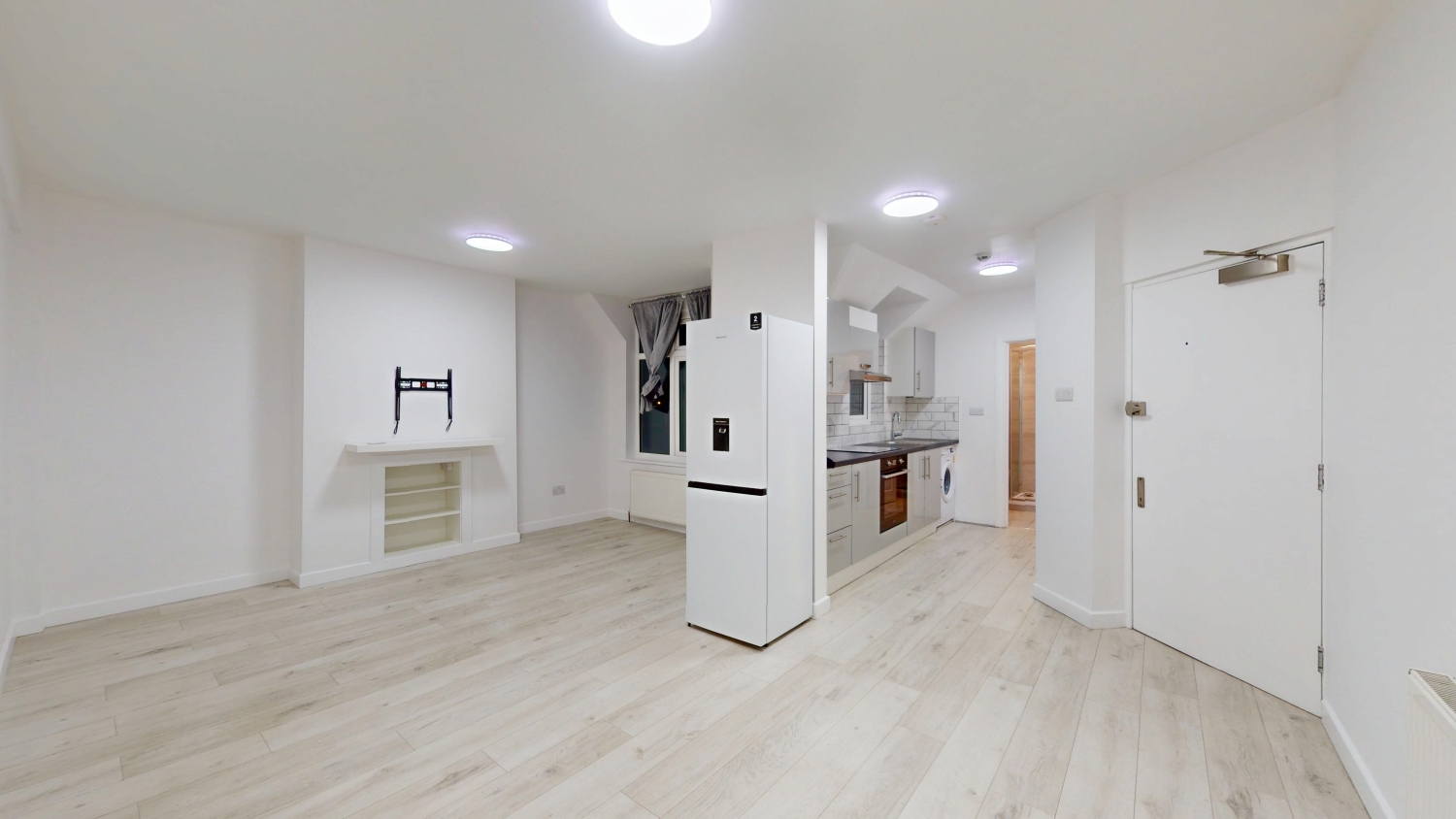 The spacious living room features contemporary light flooring, crisp white walls, and generous natural light, creating a clean and versatile space for both relaxing/dining and entertaining. The sleek, modern kitchen is fitted with plenty of storage, integrated appliances, and ample counter space—perfect for everyday cooking.